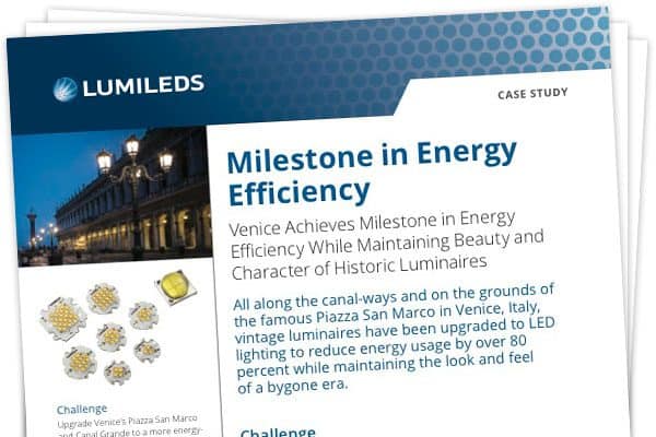Venice is a city for lovers. An evening spent traveling along the Canal Grande or strolling through the spacious Piazza San Marco is typically enhanced by a warm glow from antique luminaries — which project light on the captivating waterways and stunning architecture found everywhere the eye can see. So when it came time to upgrade to a more energy-efficient lighting solution, Venetians and historians including the Commission for the Architectural and Landscape Heritage got involved to see to it that the exact lighting quality in all of Venice be preserved.
