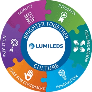 We are committed to creating a culture that inspires employees to pursue and grow their careers with us. In 2018, Lumileds launched a companywide Culture initiative designed to further bring our values—innovation, quality, execution, care for customers, collaboration and integrity—to life in everything that we do. To support the initiative, we brought together enthusiastic employees around the globe to form a “Culture Champions” network. The network helps to leverage the collective intelligence of our diverse team members to drive culture change in a way that resonates with our employees globally.