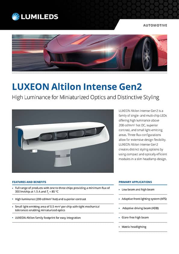 LUXEON Altilon IntenseA family of 0.5mm2 multi-die products optimized for small source sizes to enable slim head lamps.