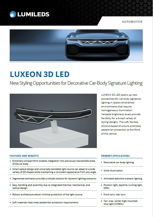 LUXEON 3D LEDLUXEON 3D LED helps you bring to life the versatile shapes of your 3D lighting design for all exterior signaling and styling functions.