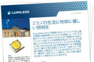 Expo Milan 2015 の開催に向け、ヨーロッパで史上最大規模の道路照明プロジェクトが始動しました。イタリアの都市ミラノは、5 月から 10 月にかけて開催される同イベントに 2,000 万人の訪問客を見込んでいます。その準備として LUXEON M (ルクセオン エム) LED を搭載した AEC Illuminazione 社の照明器具が 10 万個設置されました。優れた発光品質とエネルギー効率、そして環境に配慮した製品です。ミラノは、初年度だけでエネルギー費用を 1,000 万ユーロ節約し、CO2 の排出量を 20,000 トン弱抑えることに成功しました。
