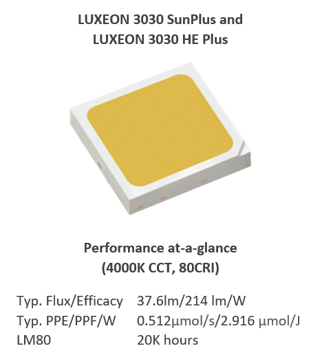 LUXEON SunPlus 3030Widely available, this top performing broad-spectrum white light delivers top rated μmol/J and PPF (μmol/s) performance and long lifetime with CCTs ranging from 2200K to 6500K.