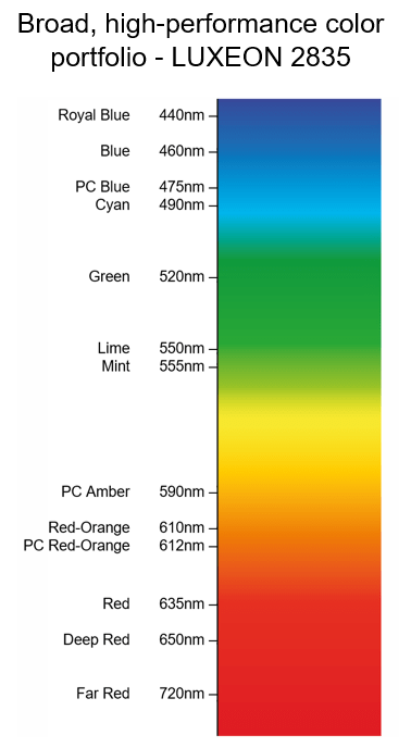 LUXEON 2835 colors span the range from Royal Blue to Far Red. five of the colors are phosphor converted (PC) including PC Blue, Lime, Mint, PC Amber, and PC Red-Orange. The phosphor converted LEDs offer additional options for flux and efficacy. The portfolio’s white LEDs are offered in 3000K, 4000K and 5700K versions.