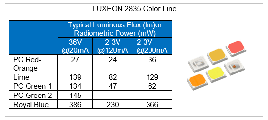 The 36V LUXEON 2835 Color Line and LUXEON 7070 emitters are available today. More information and detailed datasheets can be found at https://lumileds.com