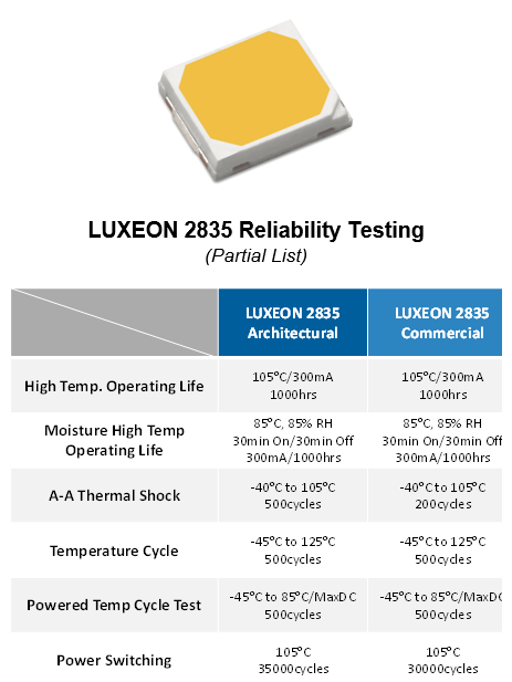 For the latest 14 part expansion, 0.2V voltage bins and 3- and 5-step simplify system design. Reliability is proven through extensive testing including High Temperature Operating Life, Moisture High Temperature Operation Life, Powered Temperature Cycle Test, A-A Thermal Shock, Temperature Cycle, and Power Switching. We believe LUXEON 2835 to be the most reliable LED in its class available today.