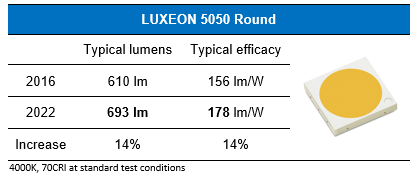 San Jose, CA – October 11, 2022 – On the sixth anniversary of Lumileds’ first  5050 LED, the company’s vision for a robust, quality package for outdoor and industrial applications has proven rock-solid with tremendous adoption worldwide. Today, Lumileds once again increases the light output and efficacy of its LUXEON 5050 Round LED. Introduced in October of 2016, LED output and efficacy have increased by 14% to 693 lumens and 178 lumens per Watt at 4000K and 70CRI. Further, the portfolio has grown in breadth and is the only 5050 offering with a full array of CCT options at 70, 80, and 90 CRI.