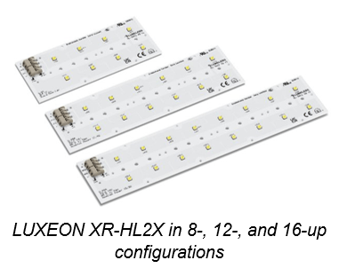 LUXEON XR-HL2XStandard modules in 8-up, 12-up, and 16-up formats on MCPCB deliver more than 2800 lumens and 184 lm/W. Simplifies and speeds up luminaire design.