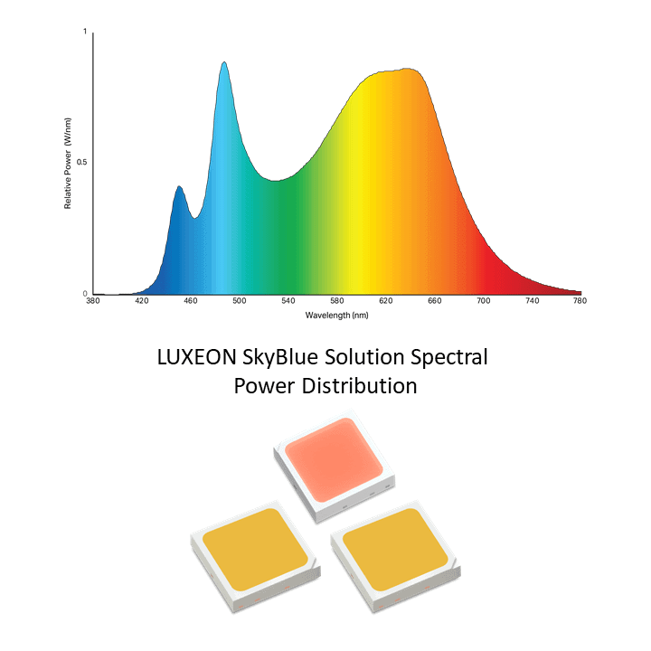 LUXEON SkyBlue is specified by CCT for melanopic ratio, CRI and R9, efficacy, and luminous flux and produces light within a 3 MacAdam ellipse space. Lumileds unique knowledge eliminates the complex analysis, binning, and supply chain issues that typically challenge a luminaire manufacturer and add to the cost and complexity of developing a solution.