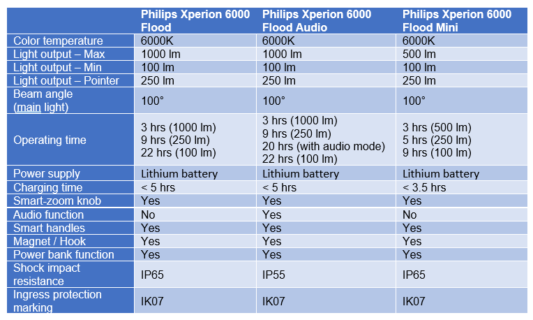 Whether lighting up a work site, temporarily replacing a wall lamp, or illuminating outdoor activities, the Philips Xperion 6000 Flood and Flood Audio lights are perfect for illuminating large, dark areas. Delivering an impressive 1000 lumens from just 10 Watts of power, their consistently bright light spreads in a  wide beam. If less light and longer battery life are needed, it’s easy to dim the lamp to just 100 lumens. The Philips Xperion 6000 Flood Mini offers a more compact way to get the job done and delivers an impressive 500 lumens with the same adjustable beam as the Flood.