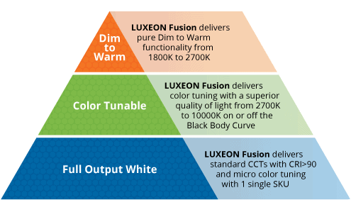 LUXEON FusionA single platform for Dim-to-Warm, Color Tuning, and Full-Output White light. 1800K to 10000K, CRI>90 and micro color tuning in one SKU.
