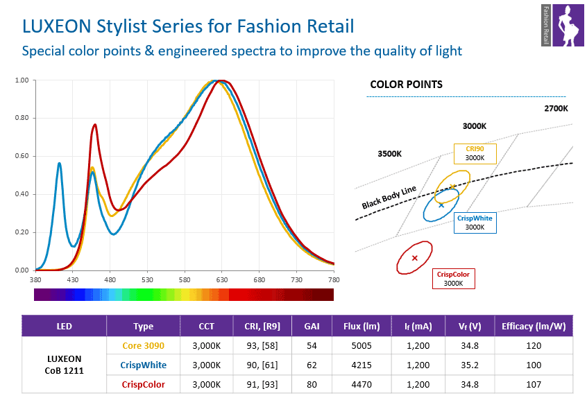 LUXEON 2835 with CrispColor TechnologyThe perfect 2835 mid-power LED for fashion retail lighting highlighting rich color and increasing contrast. CrispColor technology brings fabrics and textures to life.