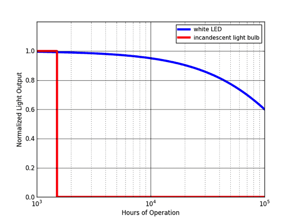 Lumen maintenance is a measurement used to determine the performance of an LED light source over time. One of the key benefits of LED technology compared to other lighting technologies is its reliability and high operating lifetime. For example, incandescent light bulbs tend to fail abruptly after approximately 1,500 hours of operation, after which they do not emit any light. The light output of an LED, in contrast, tends to degrade gradually over time and can often be described with an exponential decay model. This stark difference in behavior is graphically shown in Figure 1.