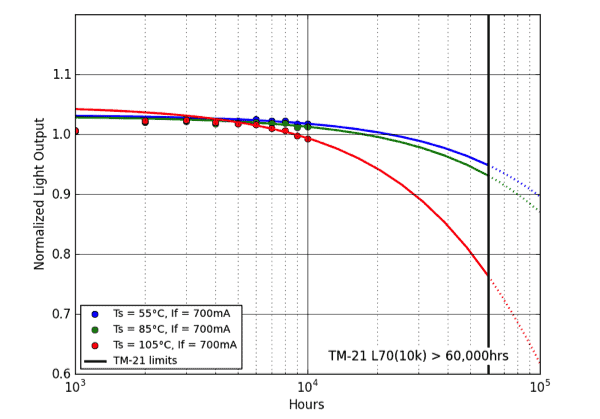 For many applications it is important to estimate when the light output will drop below 70% of the initial light output. However, given their excellent long-term performance, white LEDs typically exhibit only a small drop in light output after 6,000 hours. Therefore, the LED Industry adopted a method, described in IES TM-21-11, to fit an exponential lumen maintenance model to actual LM-80 data. This model can then be used to project the average lumen maintenance of an LED product beyond the actual number of operating hours tested. Figure 2 shows typical lumen maintenance data, collected according to LM-80, and corresponding lumen maintenance extrapolation curves, according to TM-21.